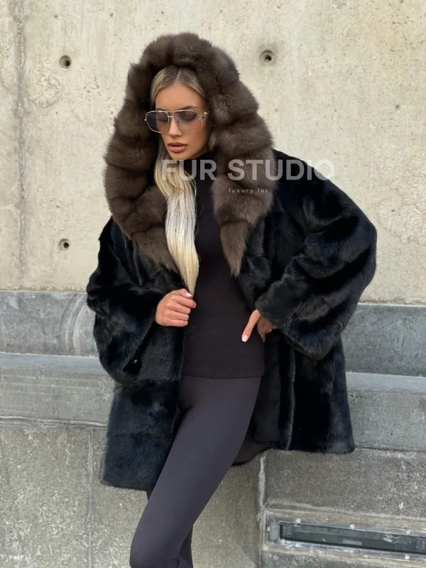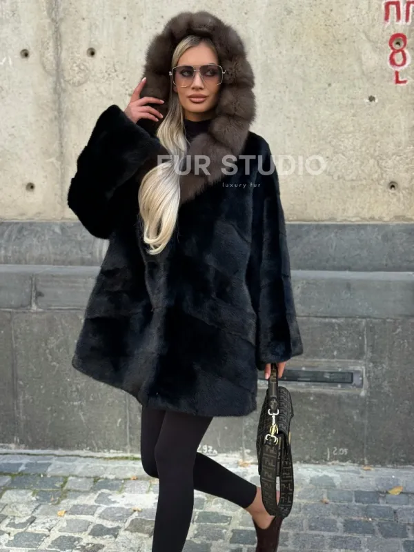 Черный норковый полушубок с капюшоном куница 102250
