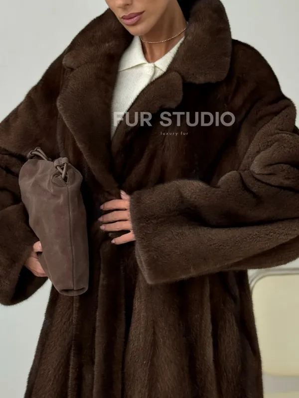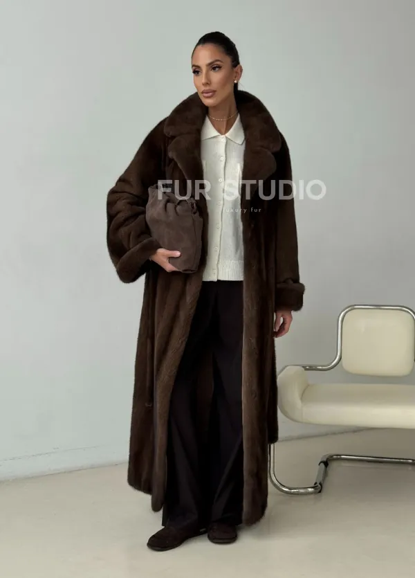 Мех данной шубы аукционная норка , цвет коричневый. Предлагается в размерах от 42 до 50. Длина модели 125-130 см, что выгодно подчеркивает фигуру девушек. Эта модель идеально подойдет для девушек и женщин, предпочитающих роскошные натуральные меха.