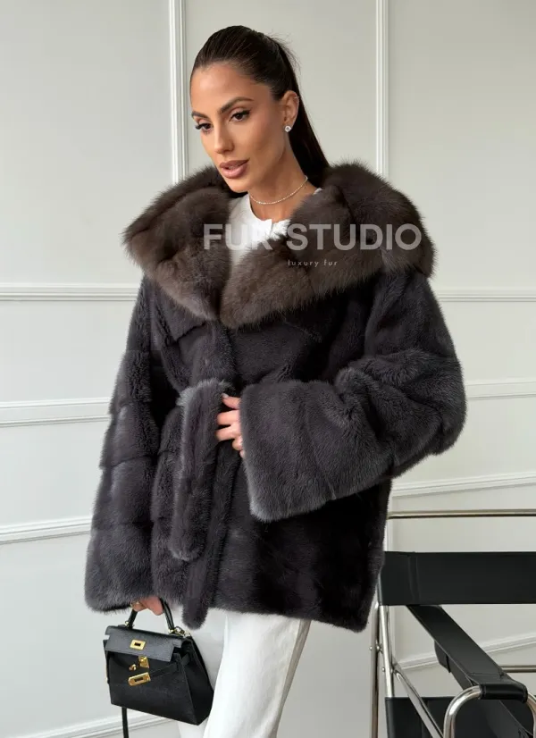 Графитовая шуба с капюшоном из куницы 102657