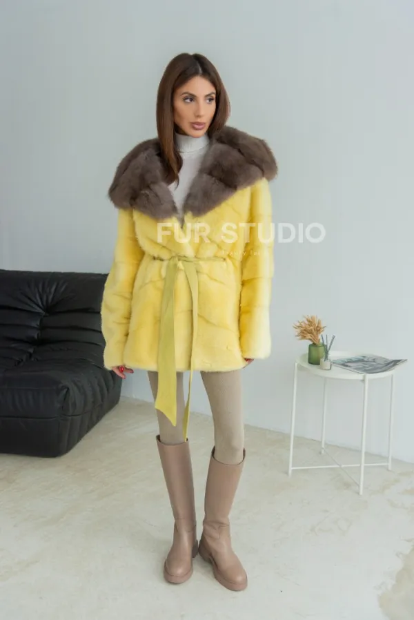Мех данной шубы аукционная норка , цвет желтый. Предлагается в размерах от 42 до 50. Длина модели 65-70 см, что выгодно подчеркивает фигуру девушек. Эта модель идеально подойдет для девушек и женщин, предпочитающих роскошные натуральные меха.