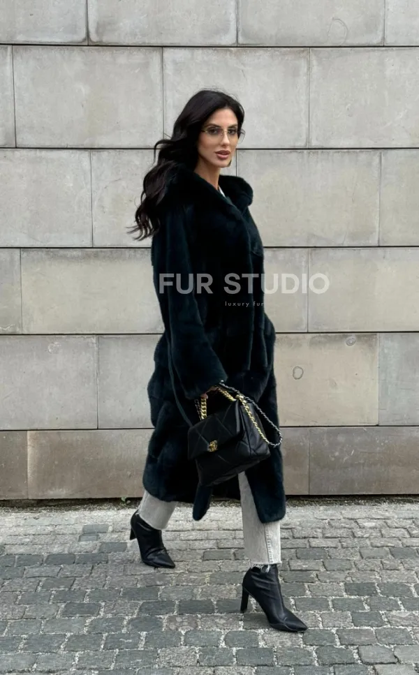 Мех данной шубы аукционная норка , цвет зеленый. Предлагается в размерах от 42 до 50. Длина модели 110-115 см, что выгодно подчеркивает фигуру девушек. Эта модель идеально подойдет для девушек и женщин, предпочитающих роскошные натуральные меха.