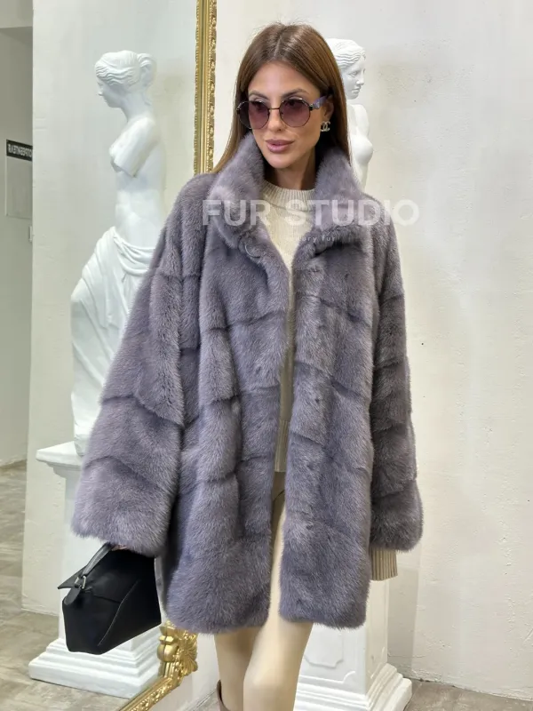 Норковая шуба стойка воротник, цвет фиолетовый – необычная модель для истинных модниц. Изделия из норки – всегда указывают на статус и вкус владелицы. Модель подчеркивает изысканность и безукоризненный стиль хозяйки. Воротник стойка акцентирует внимание на изяществе шеи. Оптимальная длина удобна при носке. Прямой силуэт подчеркнет достоинства фигура.