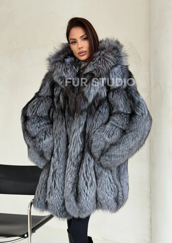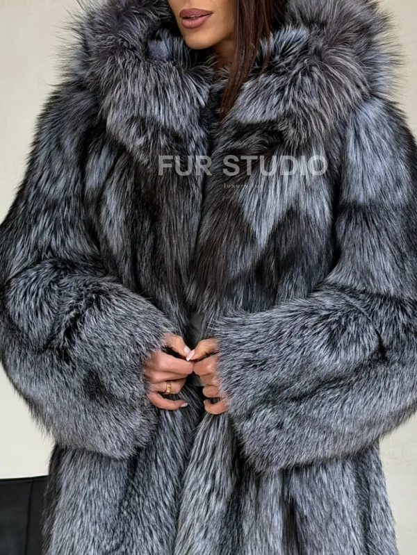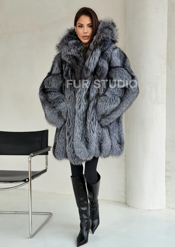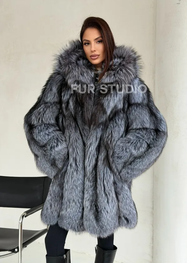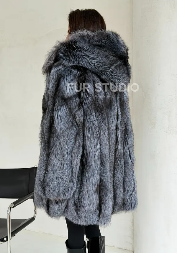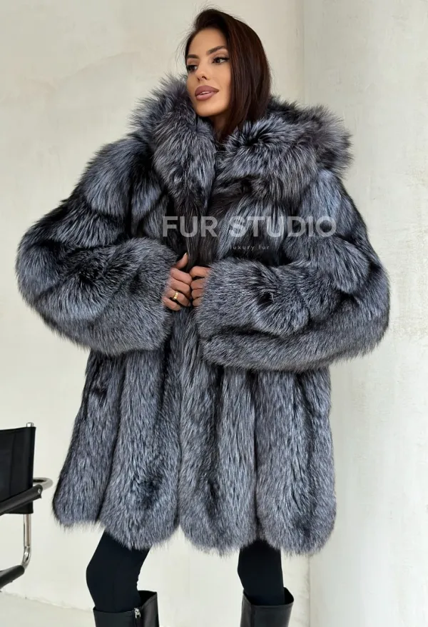 Шуба из натурального меха чернобурки с капюшоном 102686