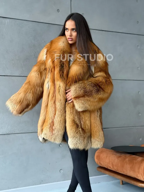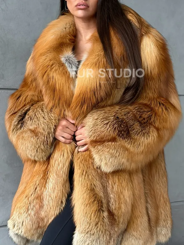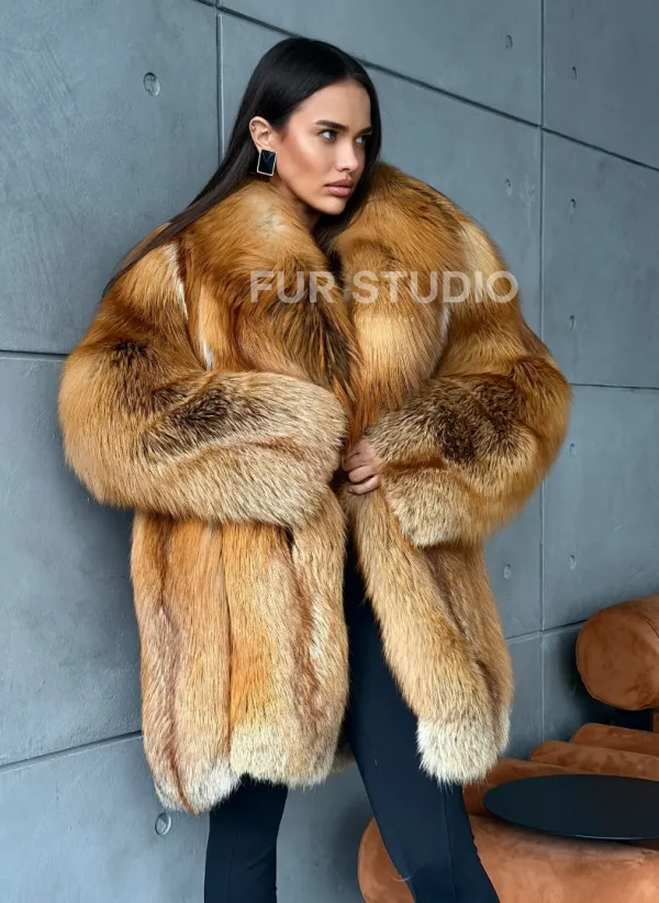 Мех данной шубы лиса, цвет рыжий. Предлагается в размерах от 40 до 52. Длина модели 80-85 см, что выгодно подчеркивает фигуру девушек. Эта модель идеально подойдет для девушек и женщин, предпочитающих роскошные натуральные меха.